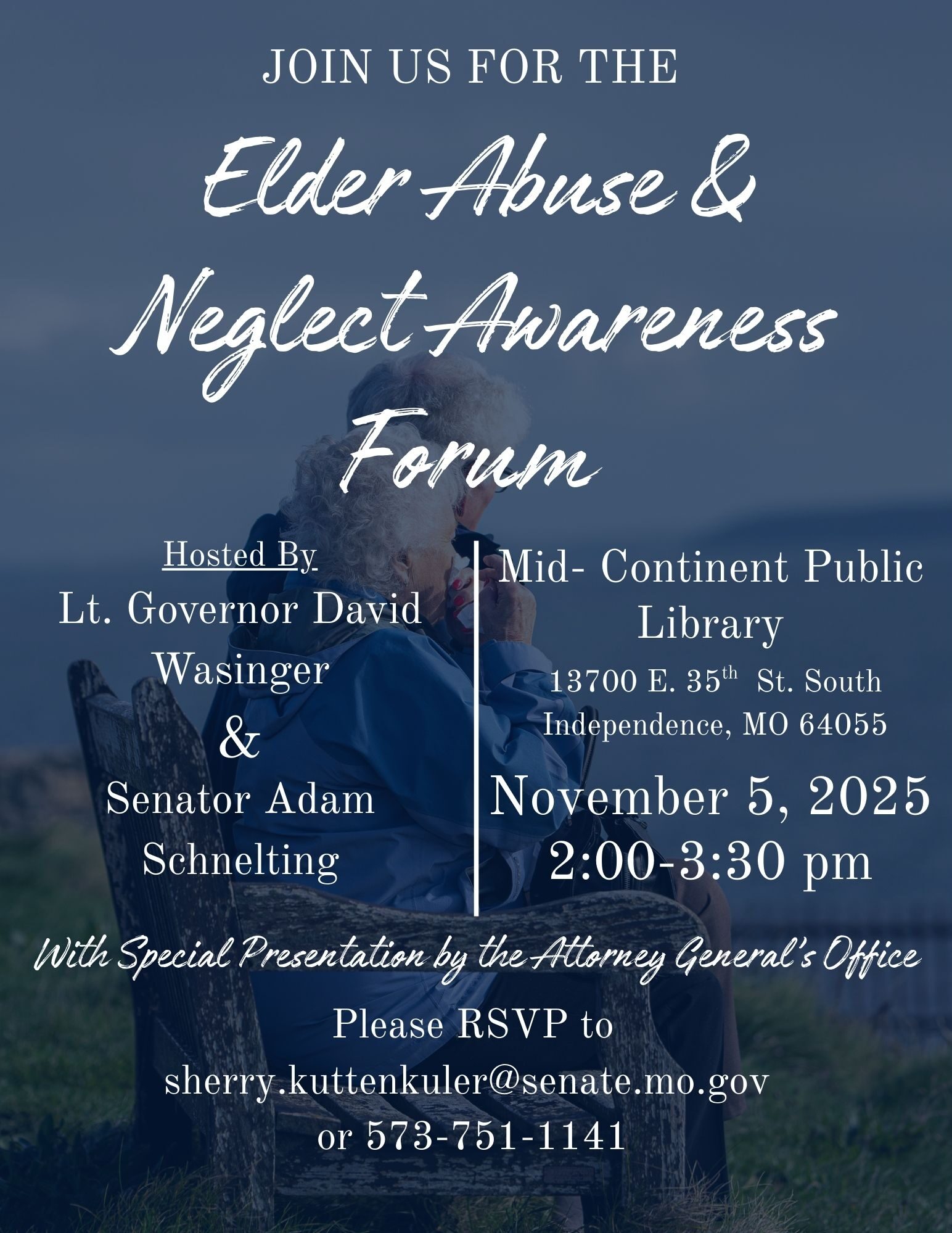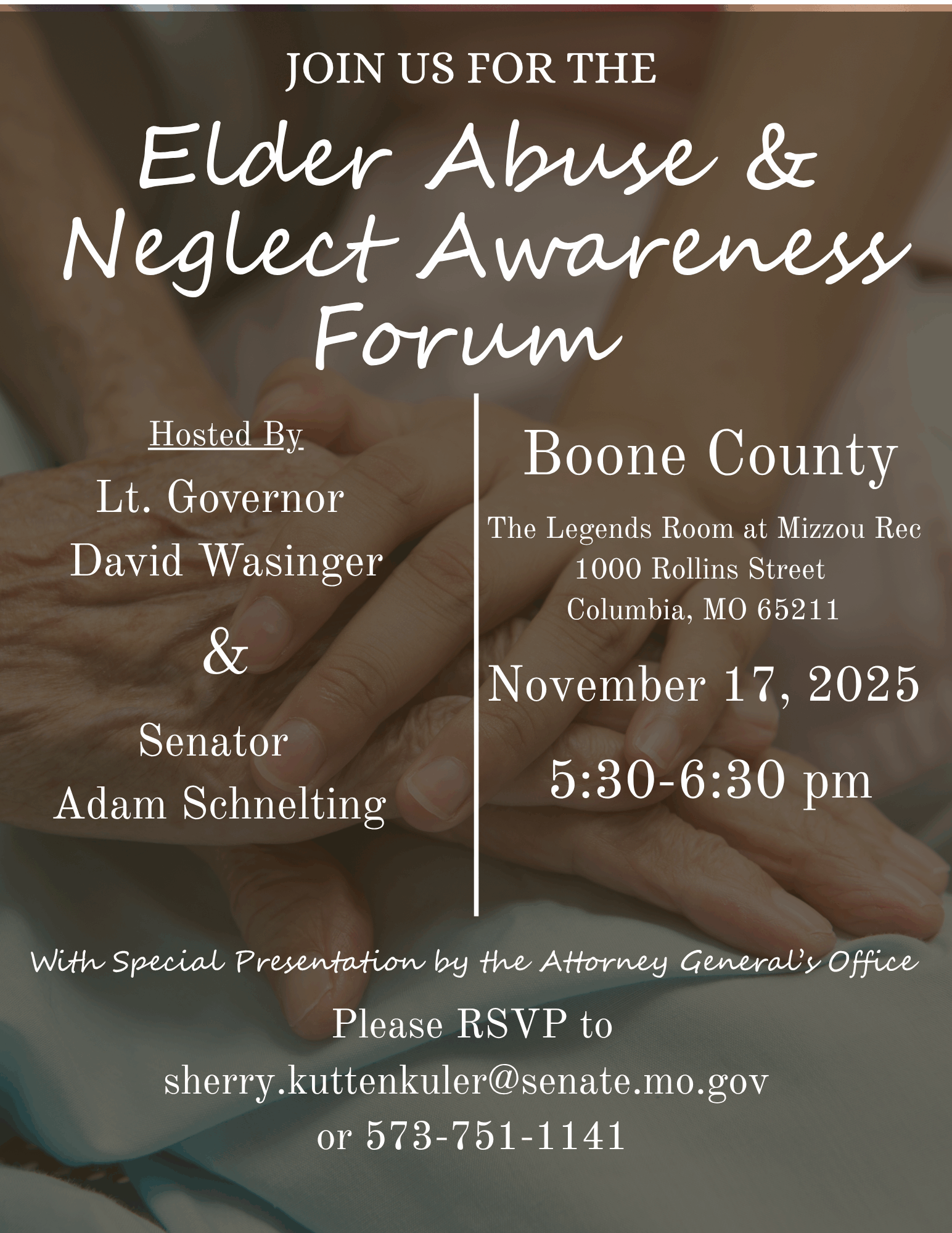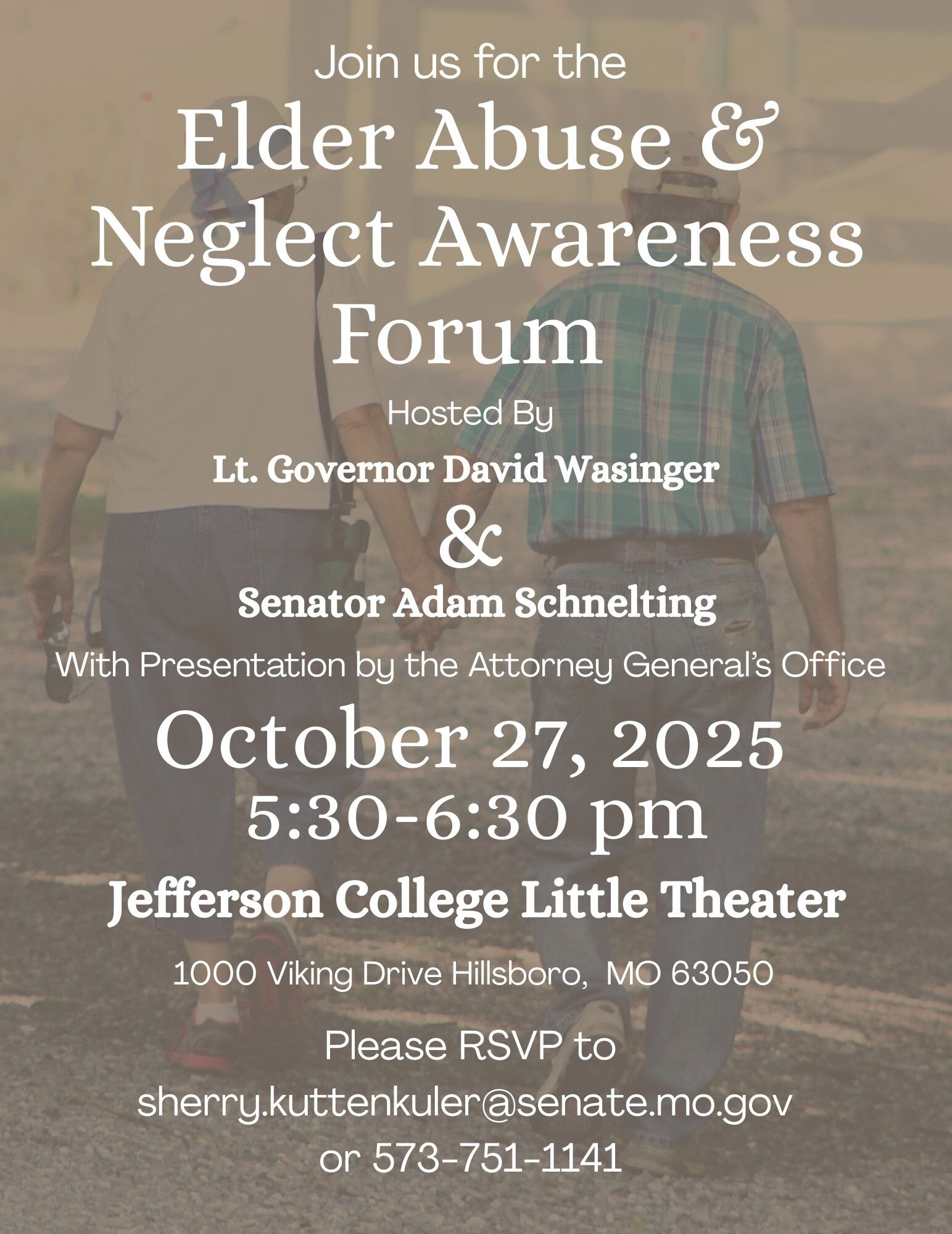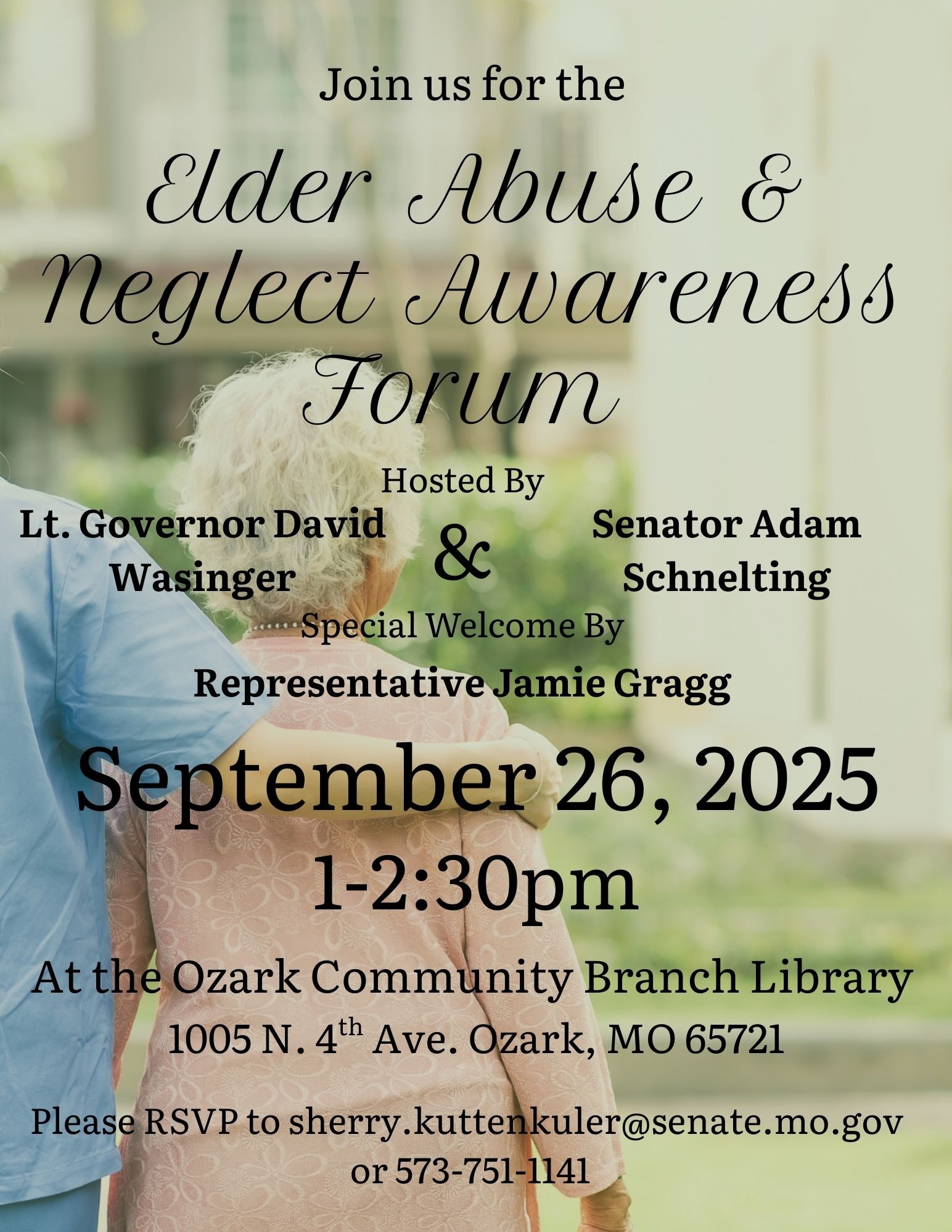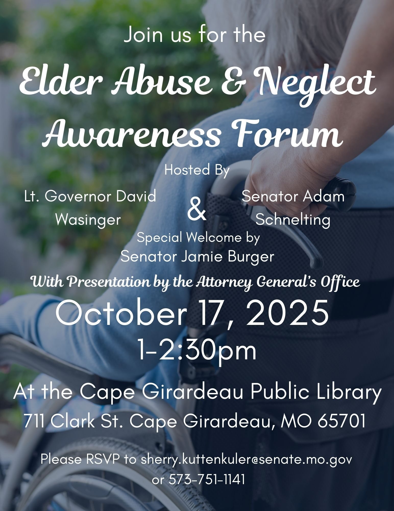David Wasinger Lieutenant Governor | State of Missouri FOR IMMEDIATE RELEASE September 4, 2025 Lt. Governor David Wasinger and Sen. Adam Schnelting Launch Statewide “Protect Our Seniors” Tour JEFFERSON CITY, MO – Building on the success of last month’s Elder Abuse Awareness Forum in St. Charles, Lieutenant Governor David Wasinger today announced a statewide “Protect Our Seniors” Tour to bring attention to elder abuse prevention, connect families with resources, and hear directly from Missourians about the challenges they face. The St. Charles event featured family testimony […]